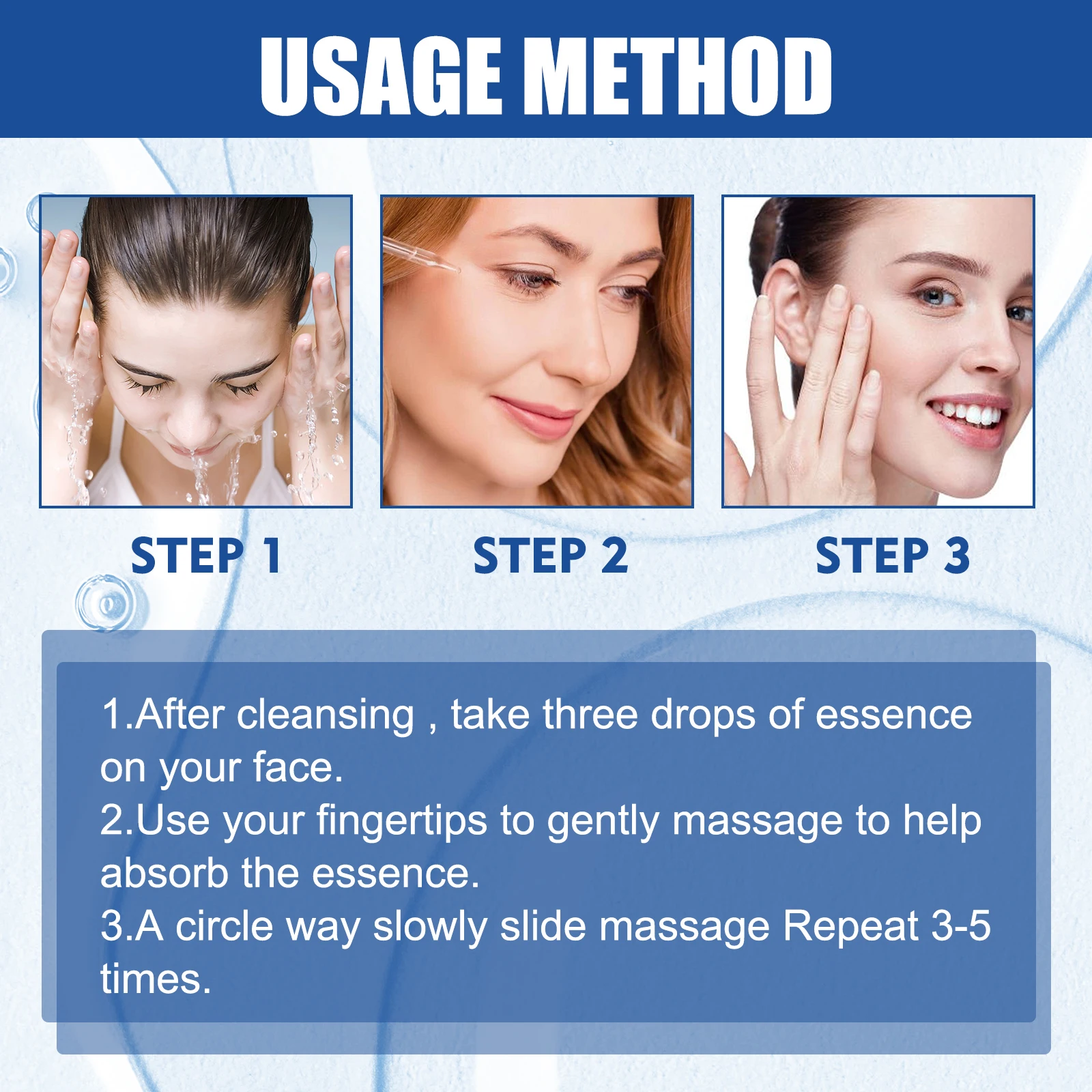 1 . After cleansing , take three drops of essence on your face